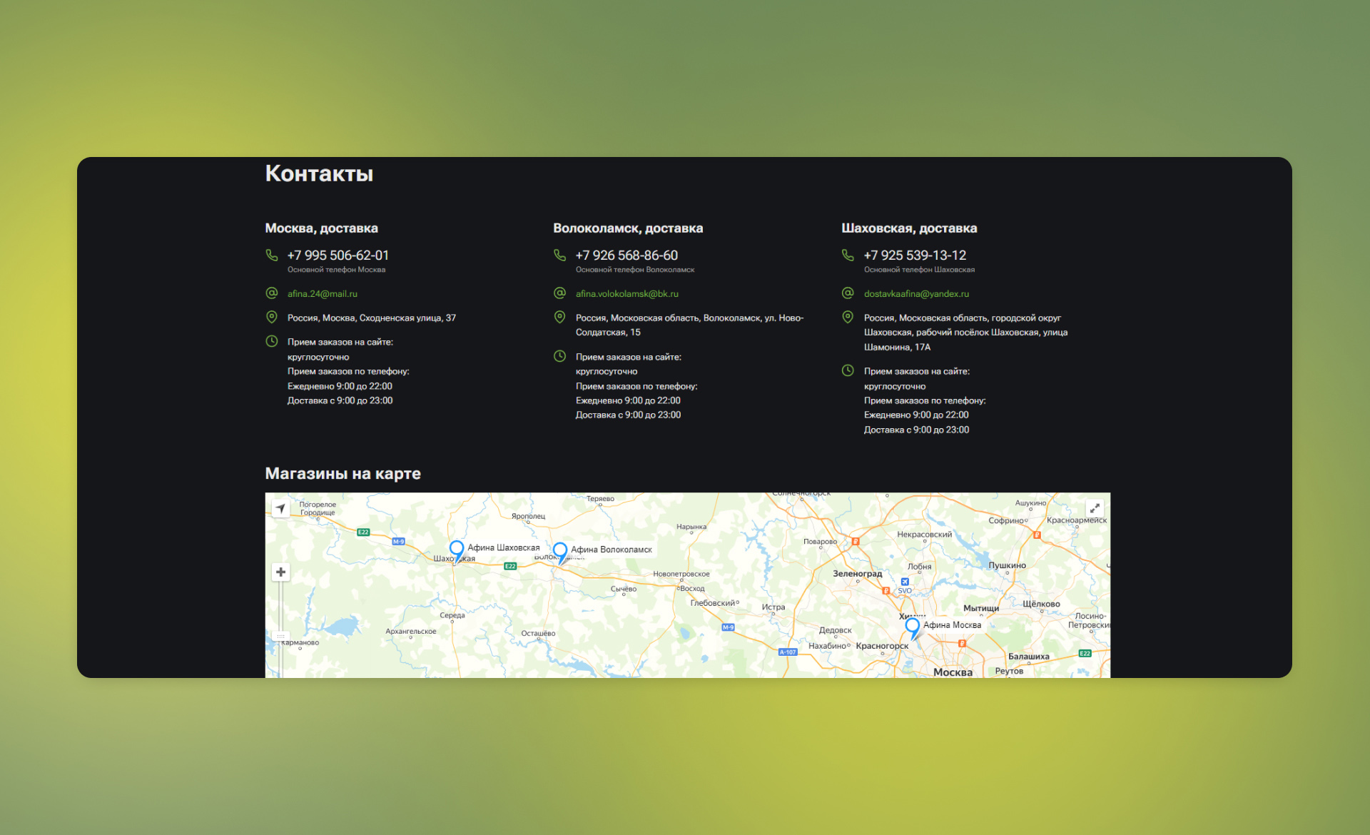 Проект имеет структуру: один бренд, работает в трех разных городах и представлен в трех торговых точках с разными юридическими лицами. При входе на сайт пользователю предлагается выбрать город, после чего отображается актуальный для данного региона каталог товаров.