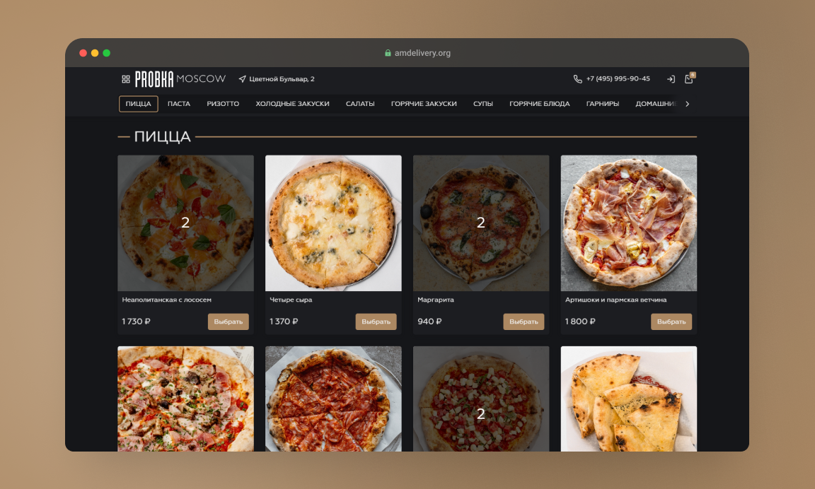 На основе нашего продукта Web Delivery мы разработали единую платформу для ресторанов Арама Мнацаканова: на одном сайте подключены к доставке несколько ресторанов разных брендов Внешний вид сайта адаптирован под фирменный стиль клиента.Список ресторанов выводится на общей главной странице. Все рестораны имеют собственные посадочные страницы, на которых выводится каталог данного ресторана.